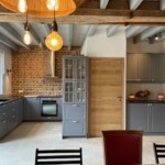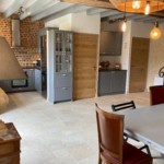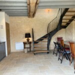 Le sol est agencé selon la haute tradition des dallages, celui dans la cuisine est posé en opus tandis que celui de la salle à manger est dans le style abbaye. Les portes sont en chêne contemporain rehaussées par des huisseries « canon de fusil » .L’escalier en fer forgé apporte une belle note décorative avec sa volute noir mate .